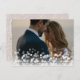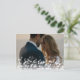 Elégante carte postale de remerciement de mariage présente une photo à fond saigné orientée paysage avec une simple incrustation de lumière bokeh pour un look chic bulle. "Avec nos remerciements" ou votre choix de message est recouvert de lettres en noir, avec vos noms à côté. Ajoutez une photo supplémentaire à l'arrière, ainsi qu'un message de remerciement préimprimé personnalisé, sur un arrière - plan à motifs botaniques neutre. Espace prévu pour votre adresse de retour et l'adresse du destinataire.