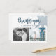 Carte postale de remerciement branchée avec une petite image bleue d'une boussole accompagnée de deux de vos photos mariages préférées. Le Merci est écrit dans un script bleu foncé et tendance écrit à la main.