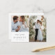Conçu pour correspondre à nos invitations de mariage en ligne. Une belle typographie basée sur le design de carte postale de remerciement avec une atmosphère minimaliste, avec "amour et merci" dans un script manuscrit moderne et la lettre serif classique. Personnalisez avec votre message et votre signature préimprimés personnalisés, et ajoutez deux photos mariages au verso avec vos noms et votre date de mariage.