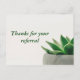 Simple et moderne, merci cartes postales pour une entreprise à envoyer aux clients, les remerciant pour leurs références. Merci pour votre recommandation. Customisez avec le nom de votre entreprise à l'intérieur. Comprend un plante succulent mignon et une écriture verte sur le devant.