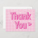 Dites Merci avec cette adorable carte postale de style rétro rose. Un arrière - plan rose cool de style rétro avec un motif en grille blanche sur le dessus. Au centre se trouvent les mots Merci en lettres roses avec une ombre portée rose chaud pour le faire ressortir. Un coeur d'amour rose mignon est à droite du mot vous.