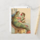Carte postale vintage adorable et amusante avec une mère poisson assise sur un tabouret qui nourrit son bébé poisson une bouteille.