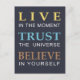 Un design de typographie élégant et moderne avec un arrière - plan bleu foncé et un texte jaune, bleu et marron, avec un message pour rappeler de vivre dans le moment et de croire que tout va bien. Pour les cartes, cartes postales, cartes pour notes, enveloppes, étiquettes et annonces.