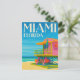 Capture the vibrant, sunny spirit of the Sunshine State with this stunning Miami Florida travel postcard! This captivating illustrated design features an iconic colorful lifeguard stand on a golden South Beach, set against the brilliant turquoise waters of the Atlantic Ocean and a clear blue sky. The stylized art beautifully captures the lively atmosphere and Art Deco charm of Miami.