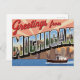 Step back in time with this retro-inspired "Greetings from Michigan" postcard. Featuring classic large-letter design elements, this vintage travel artwork captures the spirit of the Great Lakes State, showcasing a vibrant cityscape, waterfront, and iconic architecture. Perfect for Michigan residents, tourists, collectors, or anyone who loves US state travel and Americana style. Use it to send a unique greeting or display it as small, framed art.