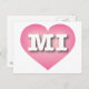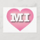 Cette carte postale est composée d'un coeur rose calme, cool et ramassé, avec un centre blanchi contenant les caractères gras, blancs et haut-coques MI, l'abréviation officielle du Michigan, l'état des grands lacs. Le verso de la carte postale est vide, en attendant vos sentiments manuscrits ou le texte customisé.