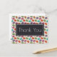 Une carte postale de remerciement avec un motif mignon de macarons de différentes couleurs sur un fond à pois discrets. Superposé par-dessus, un rectangle noir avec les mots : Merci écrits à l'intérieur. Message personnalisé au verso.