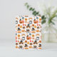 Carte postale avec un motif saisonnier de Thanksgiving. Avec des pèlerins fantaisistes, des dindes, de la tarte à la citrouille et d'autres éléments sur le thème de l'automne.