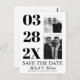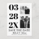 Modern black and white two photo gay Save the Date postcard. It showcases the date in black typography in a column and two photos of the couple. The phrase "Save the Date" is in script style typography. The black features two black tuxedo along with your text.