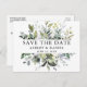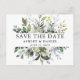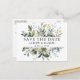 Elégante Aquarelle moderne Botanique Verdure Fiançailles Mariage Enregistrer la date La carte postale comprend les feuilles d'eucalyptus, le feuillage botanique vert, les feuilles bleus poussiéreux et d'autres belles verdure botanique.