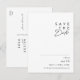 Cette carte postale "save the date" minimaliste moderne est parfaite pour votre mariage bohème chic. Son design abstrait simple et unique, accompagné d'une écriture minimaliste contemporaine et d'une palette de couleurs blanche et noire, donne à ce produit une sensation de luxe formel élégant tout en restant simple et chic bohème. Gardez-la telle quelle ou choisissez de la personnaliser avec des illustrations ou des graphiques de votre choix. Vous pouvez également consulter d'autres produits de cette collection pour rassembler l'ensemble de votre mariage !