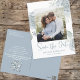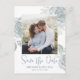 Cette belle conception caractéristiques enregistrer un code QR mariage date avec le site internet en ligne pour plus d'informations, une photo à la date simple, avec feuillage bleu floral poussiéreux, un modèle de disposition d'image photo, un élégant couple moderne engagé photo, un feuille de fleurs botaniques mariage, photos fiançailles budget carte postale, avec script de brosse calligraphie tendance, un minimaliste style style style moderne, pographie moderne script de calligraphie ush, simple enregistrer la date avec élégant modèle rose floral