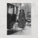 Vieille photo de femme vêtue d'une robe et d'un casquette de style années 1920, avec un West Highland Terrier et belle voiture antique.