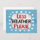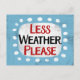 « Moins de météo, s'il vous plaît » est un dessin de texte mignon en bleu avec du texte noir et rouge, ainsi qu'une forme accentuée blanche et des points fantaisistes texturés blancs qui l'entourent.