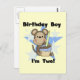 T-shirts, costumes, cartes, autocollants, magnets, sacs, et plus encore avec un mignon singe garçon avec un cupcake bleu gelé et le texte qui dit "Birthday Boy I'm Two!".