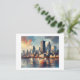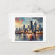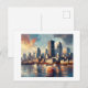 Un paysage urbain est représenté par des gratte-ciel imposants et une architecture classique, reflétée dans un plan d'eau tranquille. Le ciel est rempli de couleurs vives du coucher du soleil, ajoutant de la chaleur à la scène.