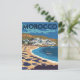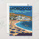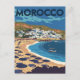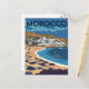 A vintage-style postcard featuring a charming Moroccan seaside town with whitewashed houses, golden sands, and blue umbrellas. Perfect for travelers, collectors, and lovers of Mediterranean beauty.