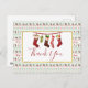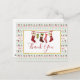 Invitation à une fête de Noël avec un motif répétitif en arrière-plan, dans le style d'un pull de Noël laid. Le motif est composé de chaussettes, de boules de Noël, d'étoiles et de flocons de neige. Avec le texte "Joyeux Noël" répété en rouge. Amusant et festif. Superposé est un rectangle blanc avec une bordure en faux doré, à l'intérieur se trouve une illustration de chaussettes suspendues à l'ancienne et le texte "Merci" écrit à l'intérieur. Message au verso que vous pouvez personnaliser.
