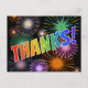 Cette carte de remerciement au design dynamique présente le message "MERCI !" avec des lettres ayant un motif de dégradé de spectre d'arc-en-ciel, sur un fond noir avec un motif coloré inspiré de feux d'artifice explosant. L'avant présente également un nom d'expéditeur personnalisé. Le verso présente un message de remerciement personnalisé. Une carte comme celle-ci pourrait être utilisée pour remercier quelqu'un qui a fait quelque chose de spécial, ou qui a peut-être assisté à un événement comme un mariage, une fête d'anniversaire de mariage ou une fête d'anniversaire.