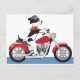 Un chien conduit une moto rouge. Ses oreilles, son foulard et sa queue volent dans le vent et son casque a des décalcomanies.