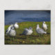 Cette carte postale présente six mouettes grises et blanches rassemblées sur l'herbe verte par jour ensoleillé sur la rive du lac Cayuga. L'eau bleue est juste au-delà. Le lac Cayuga est le plus long des lacs glaciaires Finger du centre de New York. La ville d'Ithaca est située à l'extrémité sud.