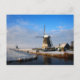 Carte postale photo d'un moulin à vent à côté d'une petite rivière à la lumière du soleil d'un matin d'hiver froid dans un paysage campagnard hollandais avec de la neige dans la Pays-Bas.