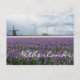 Carte postale d'un paysage avec un moulin à vent traditionnel et plusieurs moulins à vent modernes pour générer de l'énergie verte derrière un champ avec la fleur d'hyacinthe violet dans la région bulbe en Hollande et le texte : 'Pays-Bas'.