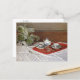 Une carte postale d'art avec la peinture impressionniste, Le Service à thé (1872), de Claude Monet (1840-1926). Une nature morte avec un service à thé en porcelaine dans un motif bleu et blanc sur une nappe en lin blanc à côté d'une plante en pot.