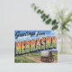 This classic retro-style design captures the pioneer spirit and vast landscapes of the Cornhusker State. It features the "Greetings from NEBRASKA" typography set against a scene with a traditional covered wagon traveling along a dirt road through expansive green fields and plains. This artwork pays homage to the state's heritage on the Oregon Trail and its agricultural identity. Perfect for fans of vintage travel posters, retro artwork, US history, and the Great Plains.