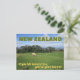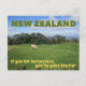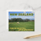 Une carte postale humoristique de Nouvelle-Zélande représentant des moutons et une vue de la ville d'Auckland avec le slogan "Nouvelle-Zélande — si vous frappez l'Antarctique, vous êtes allés trop loin.