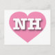 Cette carte postale est dotée d'un coeur rose vif contenant les lettres coques supérieures et audacieuses NH, l'abréviation officielle du New Hampshire, l'état granitique. Le verso de la carte postale est vide, en attendant votre texte customisé ou vos sentiments manuscrits.