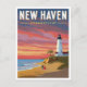A romantic, vintage-style travel poster featuring a dramatic sunset over the New Haven coastline, with a prominent lighthouse (likely Five Mile Point) on a grassy bluff. The scene captures the picturesque maritime beauty of New Haven, Connecticut. Perfect for residents, Yale alumni, and collectors of retro coastal travel art.
