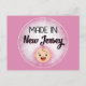 Cette drôle de carte postale présente un mignon visage de bébé blanc qui dit "Fabriqué dans le New Jersey" sur un arrière - plan rose. Parfait pour les nouvelles annonces pour bébé ou juste pour le plaisir.