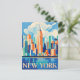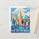 Illustration vibrante et colorée d'une ligne d'horizon de la ville célèbre, avec ses gratte-ciel emblématiques et ses monuments. L'image reflète l'énergie dynamique et la grandeur architecturale de la ville, avec ses immeubles imposants et ses rues animées. L'ensemble est audacieux et graphique, l'accent étant mis sur les toits emblématiques de la ville.