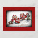 Petits aides à la Père Noël qui descendent une pente enneigée sur un traîneau. Ces elfes du début des années 1900 sont habillés dans des suites Père Noël.