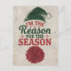 Un design avec le texte "Je suis la raison de la saison". Au-dessus du texte, il y a un grand casquette vert et pointu. Sous le texte, il y a un grand poom rouge.