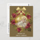Image traditionnelle du Bébé Jésus dans un ornement de boule d'or décoratif entouré d'une couronne de Noël fleurie de poinsettias. Les polices et le texte peuvent être modifiés.