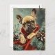 Une scène festive se déroule au recto de la carte, captant l'essence de la saison des fêtes. Un salon cosy orné de lumières scintillantes et d'un sapin de Noël joliment décoré sert de décor. Au centre de cette scène chaleureuse se trouve un charmant Bulldog français, portant un chapeau de Père Noël minuscule et une expression joyeuse qui rayonne de joie.