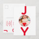 Une simple carte de Noël minimaliste et moderne en rouge et blanc. Sur le devant : Un arrière - plan blanc chic, avec le mot JOY écrit avec des lettres rouges en gras. La lettre O est utilisée comme cadre photo. Personnalisez et ajoutez votre propre photo de famille. Retour : arrière - plan blanc et texte rouge. Ajoutez vos propres salutations de vacances et nom(s) de famille. Les lettres dans le mot JOY comme décoration.