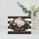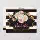 Cette carte de remerciement chic pour une fête de mariage correspond à la collection d'invitations pour une fête de mariage présentée ci-dessous et présente un motif rayé horizontal large en noir et ivoire avec une boîte de texte décorative en forme de parenthèse noire avec deux bords dorés extérieurs. Il y a un grand bouquet floral coloré en haut au centre de la carte et il comporte de belles roses de couleur crème, ivoire et rose, avec des lys péruviens orange et du feuillage vert. Le verso de la carte est ivoire et a une petite bordure inférieure noire avec une bande dorée simulée sur la largeur de la carte. Un autre petit bouquet floral est dans le coin inférieur droit. La carte est laissée vierge pour que vous puissiez écrire un message de remerciement à la main, mais vous pouvez également ajouter un message de remerciement pré-imprimé ou autre texte si vous préférez. C'est un moyen parfait