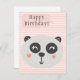 Nouvelle carte Lane - Carte postale, avec un ours panda noir, blanc, gris et rose mignon en aquarelle, avec une bulle de texte rose avec un vœu "Joyeux Anniversaire", sur un fond rayé rose et blanc. Douce conception pour l'anniversaire de n'importe quel enfant !