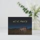 Changement d'adresse carte postale montre une petite maison ancienne dans une nuit sombre, avec une figure éffrayante à une fenêtre orange. Le texte jaune dit "Nous avons déménagé" au-dessus de la maison hantée.