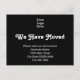Cette carte postale mobile a un texte blanc que vous pouvez customiser. Cette carte postale noire indique actuellement que Nous avons déménagé Veuillez visiter notre nouvel emplacement. Des lignes de texte supplémentaires peuvent être customisées pour votre nom d'entreprise, votre nouvelle adresse et votre numéro de téléphone. Une image d'espace réservé se trouve en haut. Vous pouvez remplacer l'image par le logo de votre entreprise,