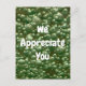 Boostez le moral au bureau avec cette carte de remerciement d'entreprise peu coûteuse. Une photo de bulles vertes flottantes fournit le fond de "Nous vous apprécions". Un message de remerciement et le nom de votre entreprise sont indiqués au verso. Tout le texte peut être facilement personnalisé pour répondre à vos besoins.