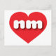 Cette carte postale est dotée d'un coeur rouge vif contenant des lettres coques inférieures arrondies et audacieuses, blanches, gravées en nm, une abréviation ludique pour le Nouveau-Mexique, pays enchanteur. Le verso de la carte est vide, en attendant votre texte personnalisé ou vos sentiments manuscrits.