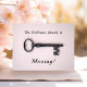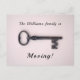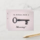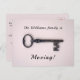 Affiche une clé squelette antique sur un arrière - plan rose. Le texte principal dit "La famille Williams est en mouvement !" et peut être customisé. Les coordonnées au verso peuvent être changées en votre nouvelle adresse. Design minimaliste, propre et féminin. Pour déménager dans une nouvelle maison, avec votre nouvelle adresse, téléphone, numéro et autres coordonnées.