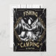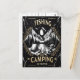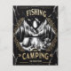 Illustration en noir et blanc représentant une scène de camping tranquille avec une tente, un feu de camp et une canne à pêche sur fond de montagnes et de pleine lune. Le texte Pêche et Camping Go Together est superposé sur l'illustration.