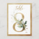 Belle carte de numéro de table avec un motif botanique - une aquarelle illustrant le feuillage verdoyant et les numéros d'effet doré. Tableau 8. Veuillez vérifier tous les numéros disponibles