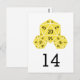Est-ce que rencontrer votre futur conjoint et tout ce qui mène à votre fiançailles vous a donné l'impression d'avoir roulé une vingtaine ? Si oui, cette carte postale geeky chic D20 Dice Mariage Numéro de table est parfait pour vous! Doté d'une matrice D20 plus grande et de deux petits dés, cette carte de table élégante mais nerveuse en jaune est facile à customiser avec vos détails mariages. Cliquez sur "Customiser" pour trouver d'autres options de personnalisation.