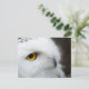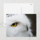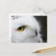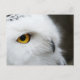 Photo du profil d'une belle chouette blanche enneigée aux yeux d'or.